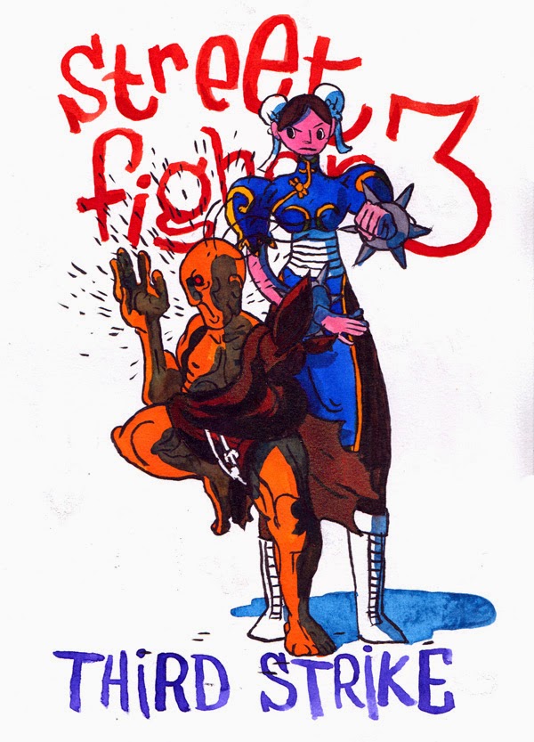 en attendant de trouver une façon décente d'enterrer/recycler/réparer ce blog déficient - je prévois un défilé de chevaux et un immense cerceuil symbolique couvert de fleurs blanches avec un ballon gonflable gigantesque représentant une tête d'animal qui pleure, ça sera très fort en terme d'image - en attendant de trouver cette façon donc, je culpabilise toujours de ne pas le mettre à jour. Voici donc quelques fanarts de Street Fighter III spéciale dédicace à Mëgaboy, Bolt et au troisième invité mystère dont je parle plus bas.